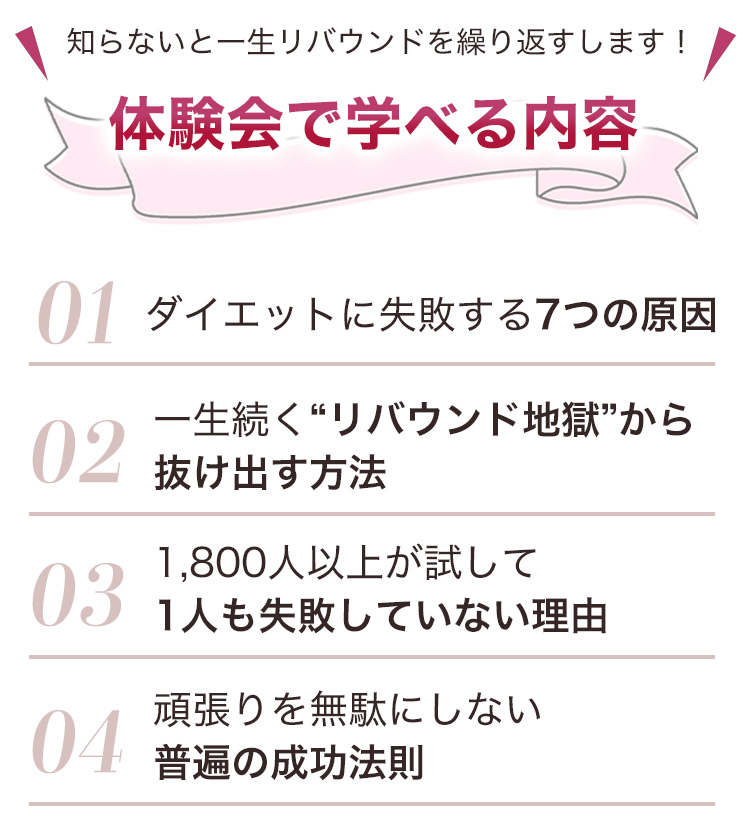 お申込みいただいたダイエットアカデミー体験会では、このような成果を再現性高く出すためのポイントをお伝えしています。
